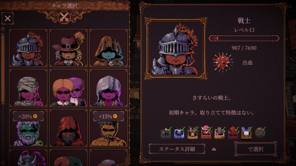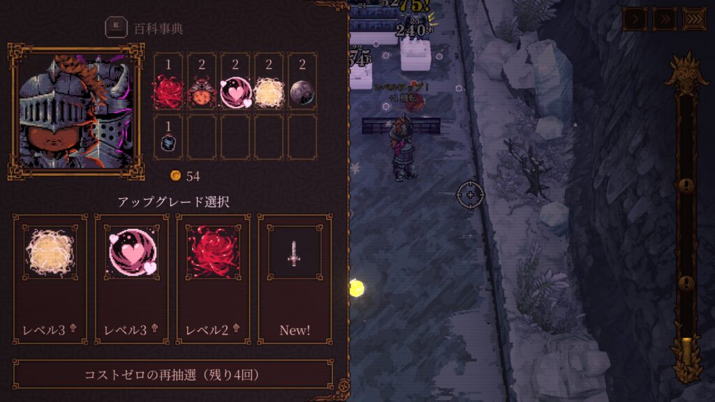 出撃中に経験値を集め、レベルアップしてランダムに提示される条件(アップグレード)を選んで進めていく。