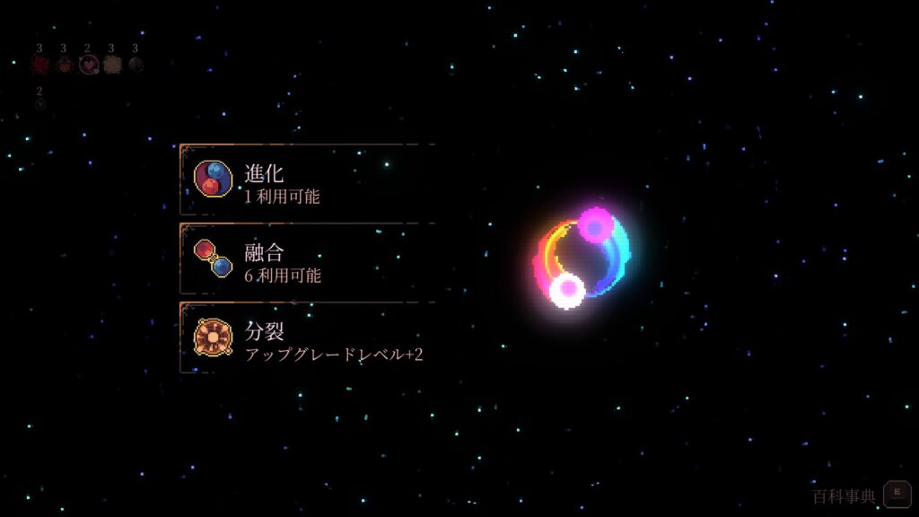 さらに、経験値でのレベルアップとは別に稀にドロップする虹色のアイテムを獲得すると「進化」・「結合」・「分裂」が行える。